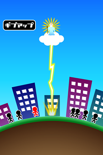 まず空の上のいる神様を左右に動かして、地上にいる人の中から悪人をさがしましょう。悪人は赤い色なので、すぐに見分けがつきますが、黒い色の普通の人と一緒に動いているので、カミナリを落とすタイミングを間違えないようにしましょう。悪人以外にカミナリを落としてしまうとゲームオーバーです。