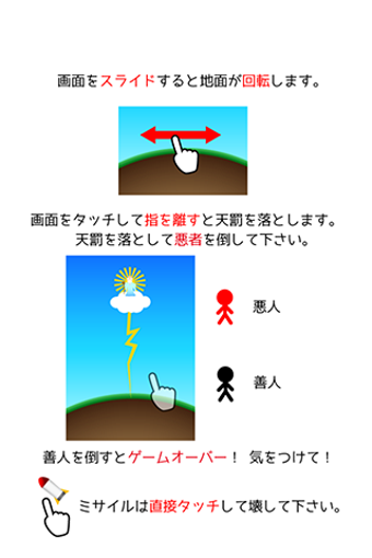 画面をタップするとカミナリが落ちます。また、神様を左右に動かすには画面をタップしたまま左右にスライドさせますが、移動した後に指を離すと、そのタイミングでもカミナリが落ちてしまうので気をつけましょう。また、悪人はなんと神様に向かってミサイルを撃ってきます。ミサイルはタップで撃ち落せますが、「神様に刃向うなんて・・」というぶっ飛んだシチュエーションに驚いてしまいます。この他のぶっ飛んだゲームには麻生でホッピングやオヤジとちゃぶ台があります。